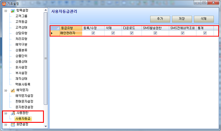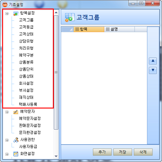 각 관리 메뉴들의 세부 그룹, 등급, 유형, 분류등의 설정등이 가능합니다.