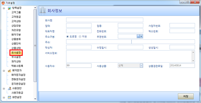 회사설정의 경우 가입자 본사의 정보를 입력하시기 바랍니다.