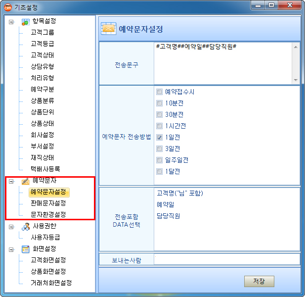 전송문구 변경도 가능하며, 고객명, 예약일, 담당직원으로 자동으로 등록가능합니다.