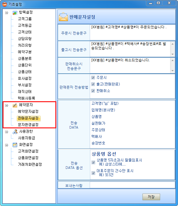 주문시, 출고시, 취소시 문자 발송이 가능합니다.