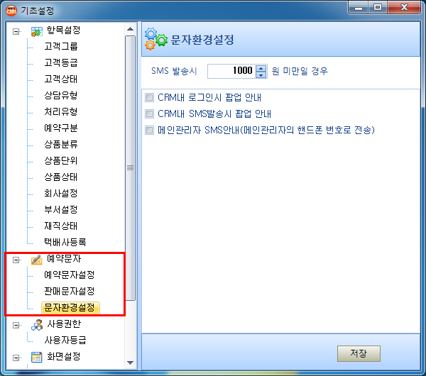 CRM내 로그인시, SMS 발송시, 메인관리자에게 SMS 발송도 가능합니다.
